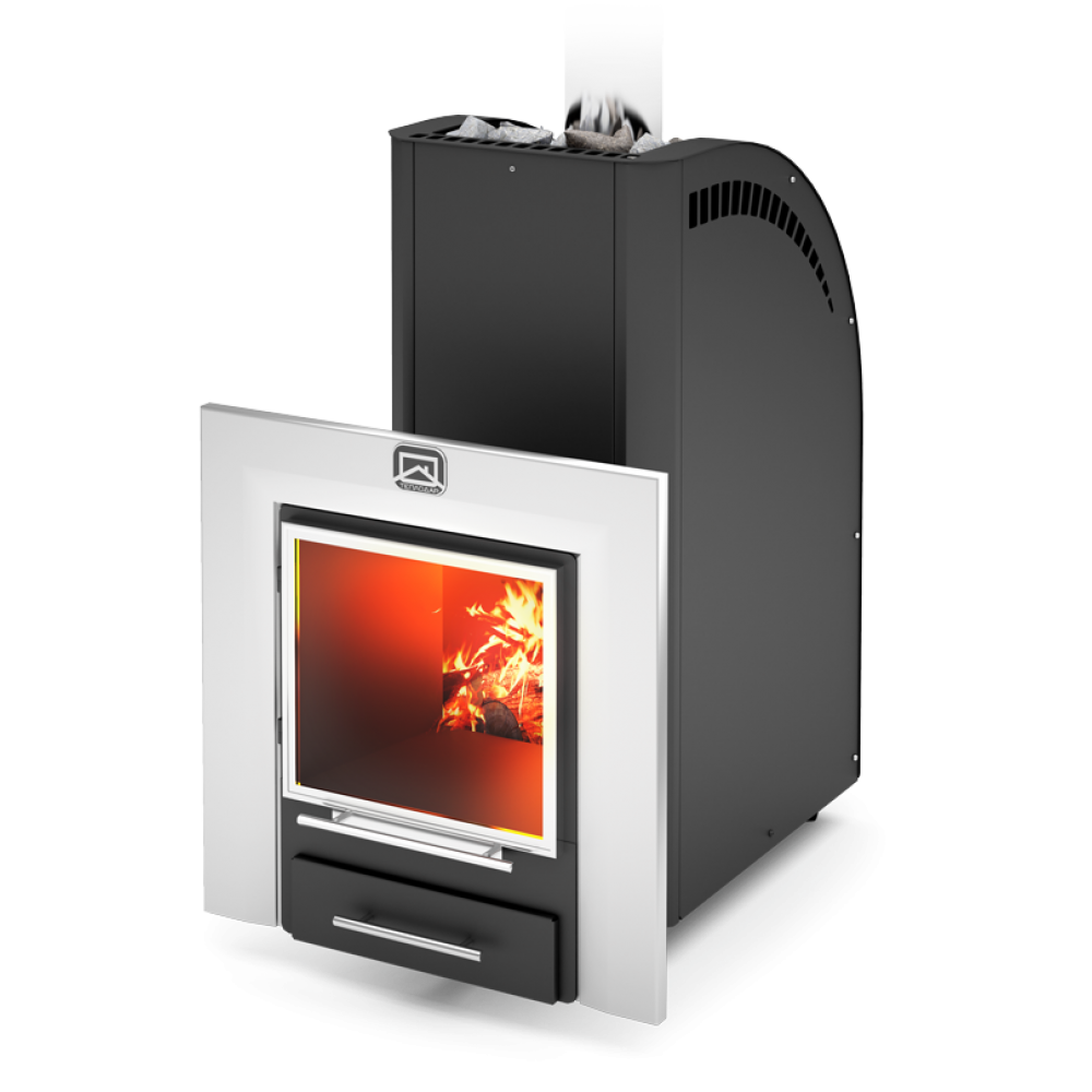 Т – топка печи из высококачественной конструкционной стали. Печь для бани с небольшой парилкой с комфортной комнатой отдыха. Помимо качественного пара эта небольшая печь позволяет любоваться горящими дровами через панорамную дверцу каминного типа.