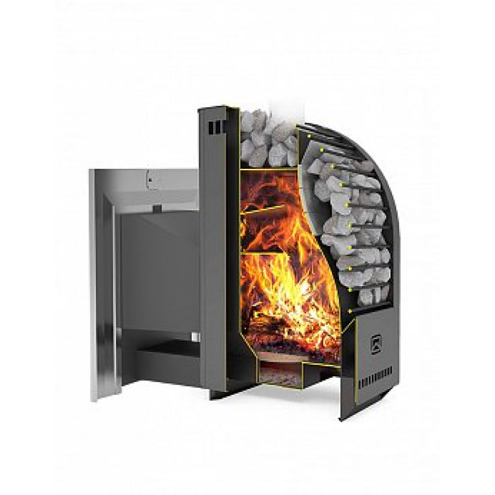 Каменка печи даёт очень много мягкого тепла от раскалённых камней, что в сочетании с боковыми нагревательными поверхностями создаёт совершенно удивительный микроклимат в парной.