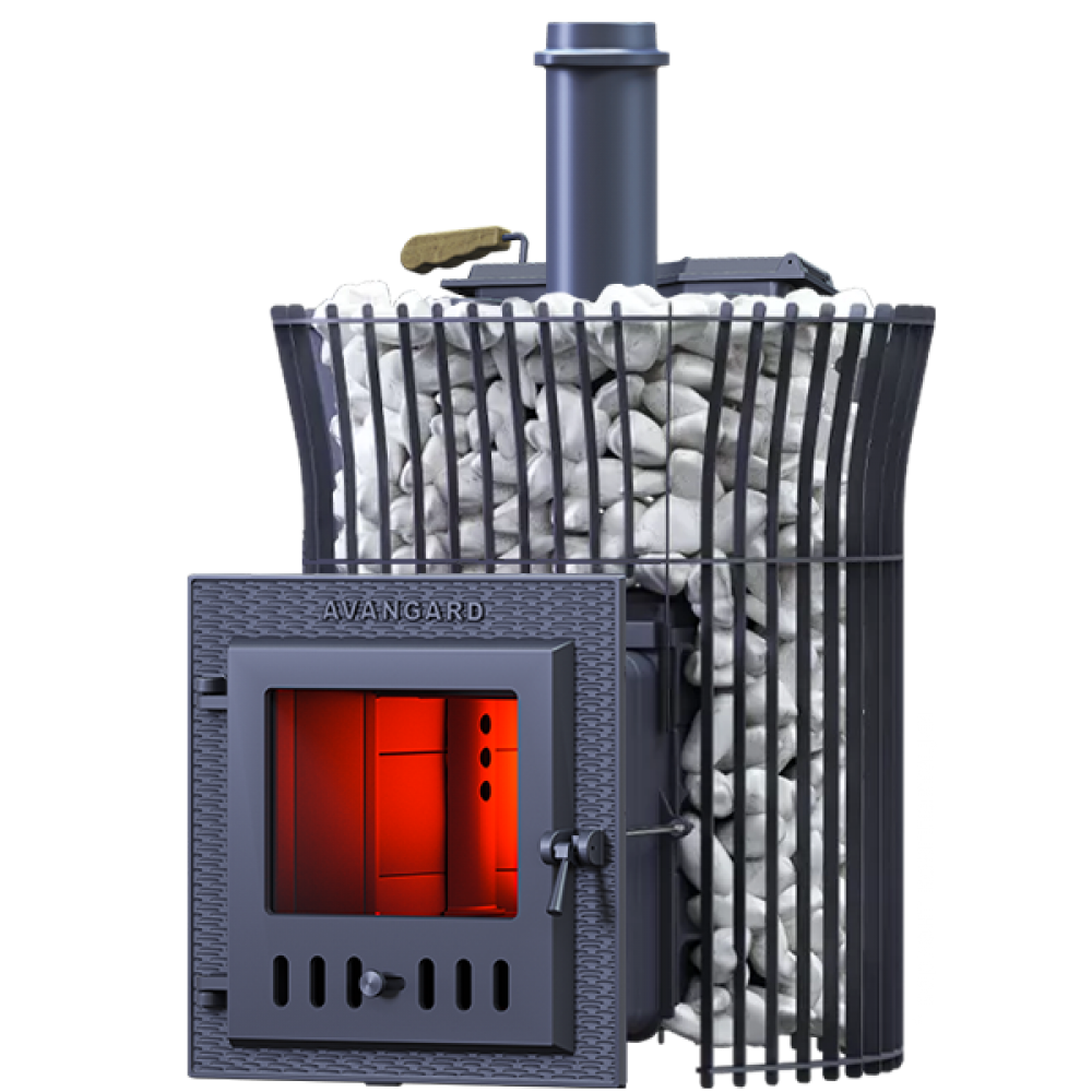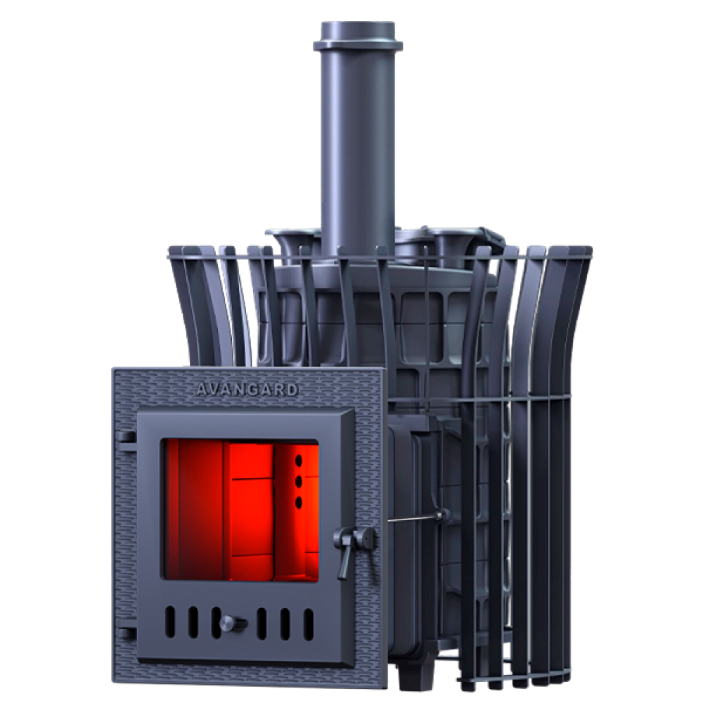 Масса пароиспарителя в печи AVANGARD 51 кг, и он нагревается прямым контактом с пламенем. У пароиспарителя 2 поверхности с увеличенной рабочей площадью – снизу идёт нагрев огнём, а сверху поддаётся вода для пара. У печи уникальная, массивная каменка с теплонакопительными воронками, для получения легкого пара.