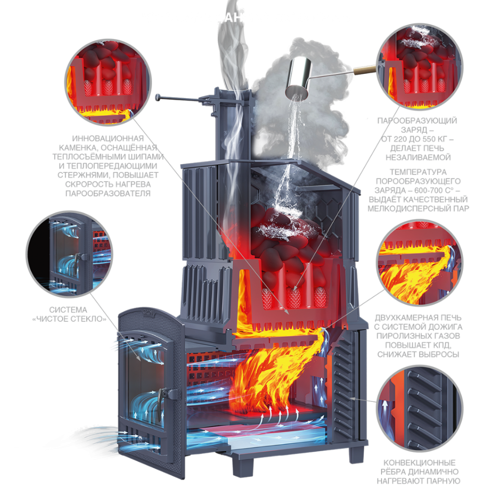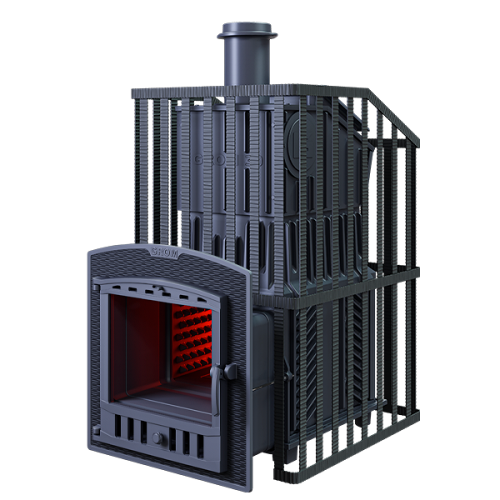 Печи линейки «GROM» имеют в комплекте чугунный короб для установки на каменку и чугунную стартовую трубу длиной 500 мм. Увеличенная масса, толщина боковых стенок 14 мм повышают надежность и теплоаккумулирующую способность, а для быстрого нагрева парной боковые стенки оборудованы конвекционными ребрами не только снаружи, но и на внутренней поверхности.