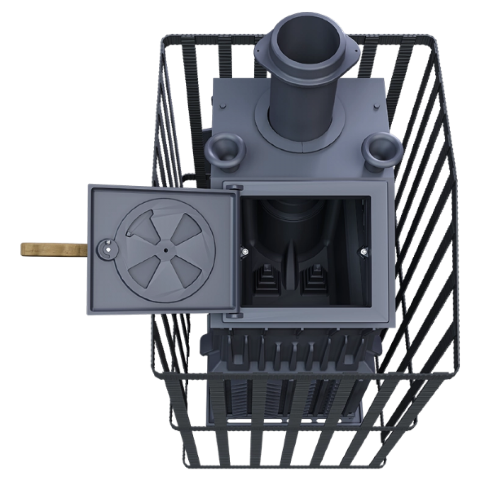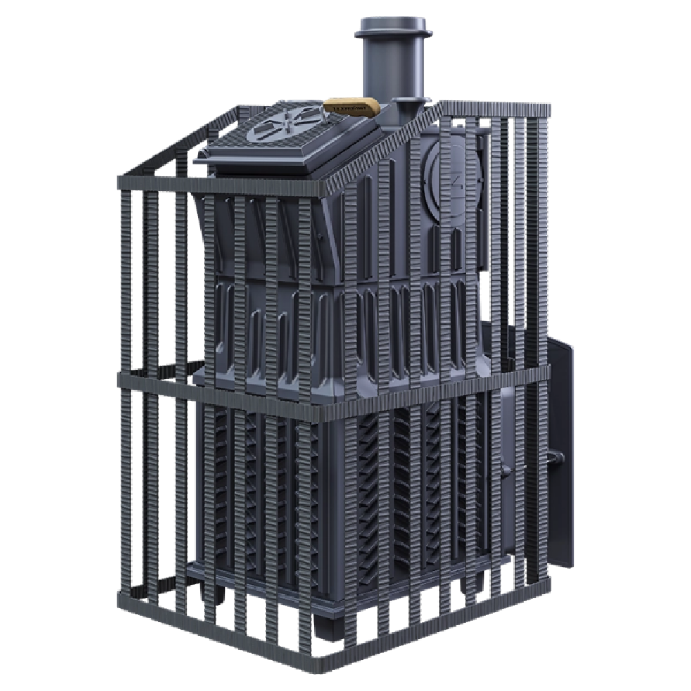 Печь легко модернизируется до полноценной печи предназначенной для Русской бани путем замены стальной сетки на каменную облицовку без демонтажа дымохода.