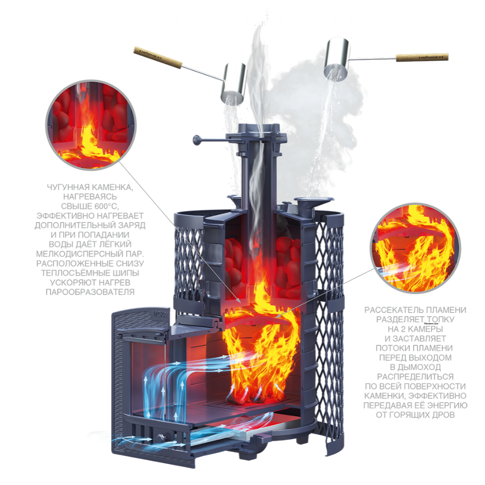 Модель Гроза Ураган выполнена на базе топочного агрегата GROZA - экономичная модель для частного применения. Основной принцип работы печи сохранён – получение пара с теплоёмкой каменки прямого нагрева. Каменка является сводом топки, нагревается с нижней поверхности снабженной теплосъемными шипами для увеличения контакта с пламенем.