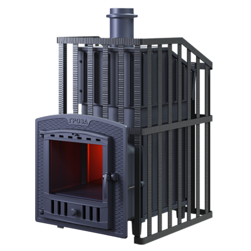 Печь для бани GROZA 18 (П2) Ураган - расширенный комплект печи в сетке. Максимально приближенный вариант печи для режимов русской парной, имеющий непосредственно закрытую чугунным коробом каменку, дверцу для пара с ручкой из бука, увеличенную до 50см чугунную стартовую трубу. Печь легко модернизируется до полноценной печи предназначенной для Русской бани путем замены стальной сетки на каменную облицовку без демонтажа дымохода.