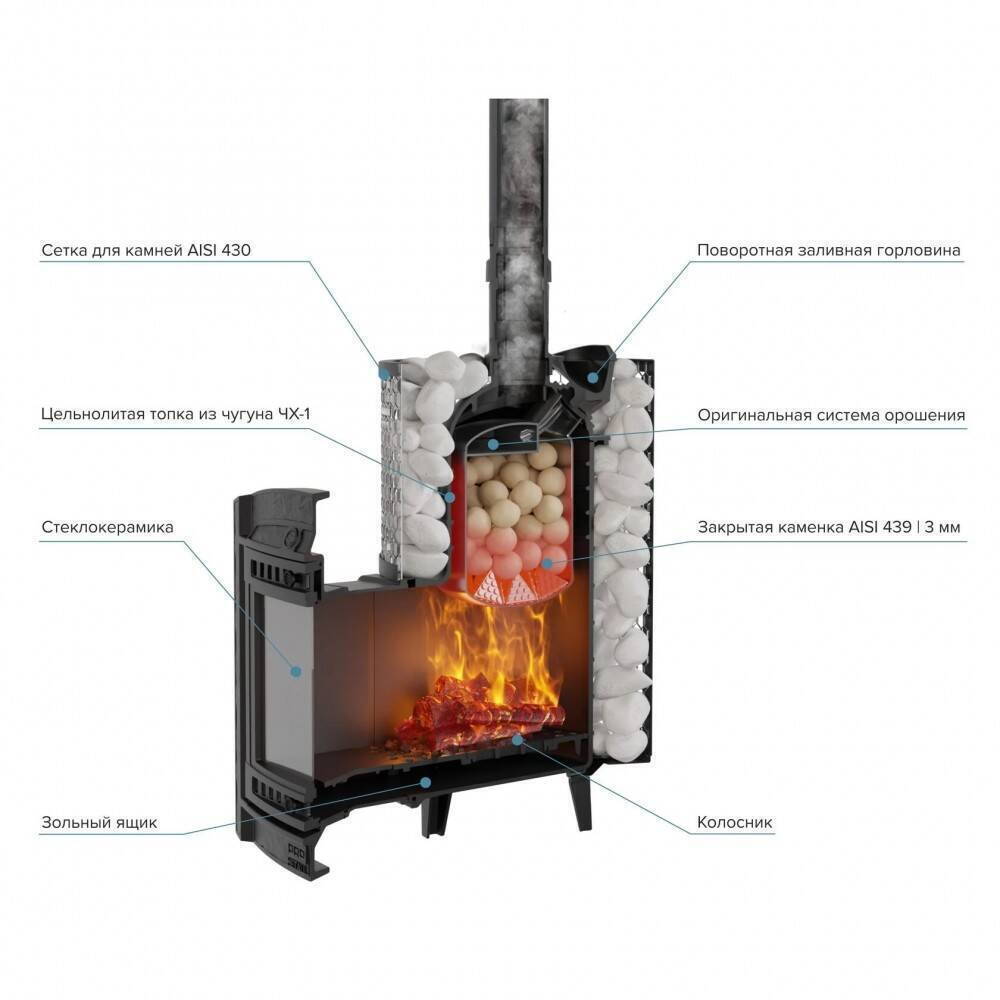 Печь для бани или сауны Атмосфера L с сеткой для камней из нержавеющей стали выполнена из цельнолитого корпуса из чугуна толщиной 9 мм с добавлением хрома. Модели этих печей имеют повышенную эффективность горения за счет использования вихревой технологии, которая увеличивает теплоотдачу за счет усиленного притока воздуха непосредственно в камеру сгорания.