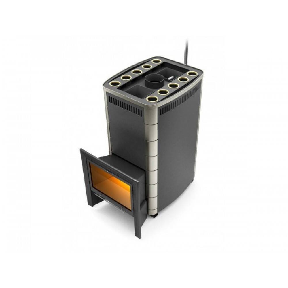 Быстрый нагрев парилки обеспечивает двухрядный десятицилиндровый теплообменник, который значительно увеличивает поверхность нагрева печи, не изменяя ее габариты. Глубокая закрытая каменка прогревается пламенем со всех сторон, обеспечивая качественный прогрев каменной закладки. Специальная трубка для дистанционного впрыска воды позволяет подавать воду в каменку, не приближаясь к печи. Вертикальный выхлоп пара из каменки повышает удобство и безопасность эксплуатации.
