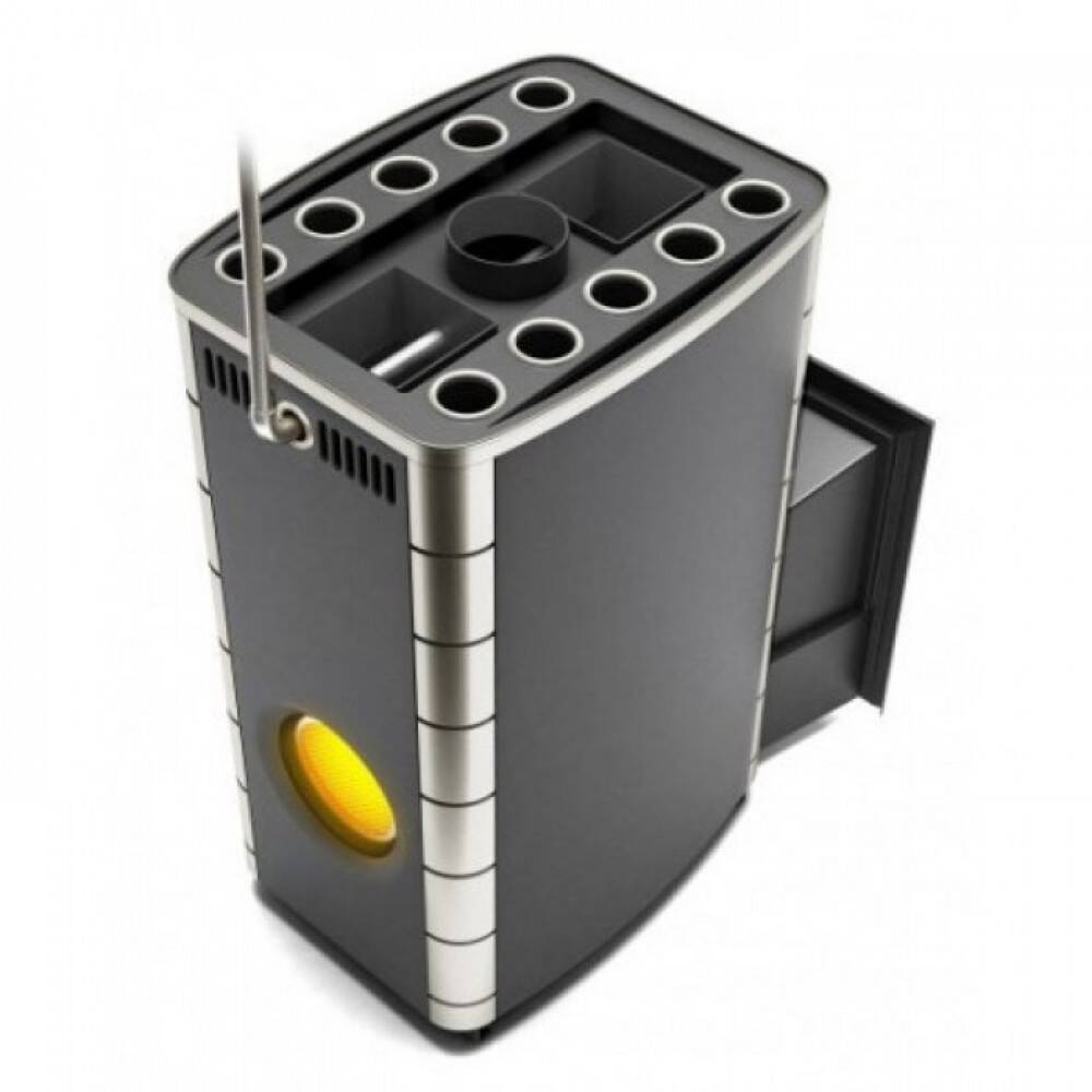— Печь имеет две модификации: со светопрозрачным иллюминатором и без. Светопрозрачный иллюминатор в топке позволяет наблюдать и контролировать горение из парной, а широкий светопрозрачный экран топочной дверцы (диагональ 50 см) комфортно наблюдать за пламенем с разных точек.