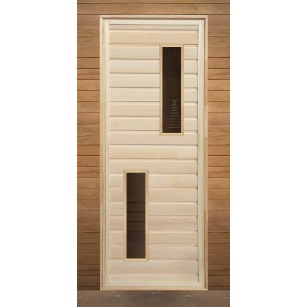 Дверь для бани деревянная со вставками из закаленного стекла предназначена для установки в парном помещении.