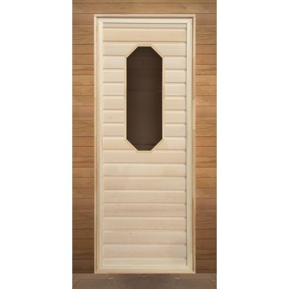 Дверь для бани деревянная со вставкой из закаленного стекла предназначена для установки в парном помещении.